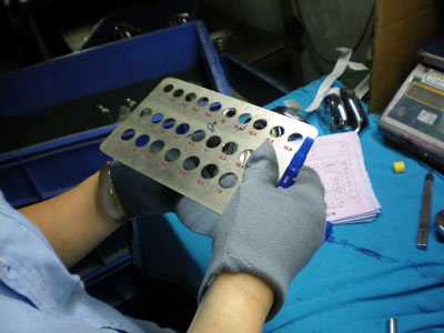 研磨後の検品作業。ヘッドにピンホール(穴)がないか、ヘッド重量は基準内に収まっているかなどチェック。