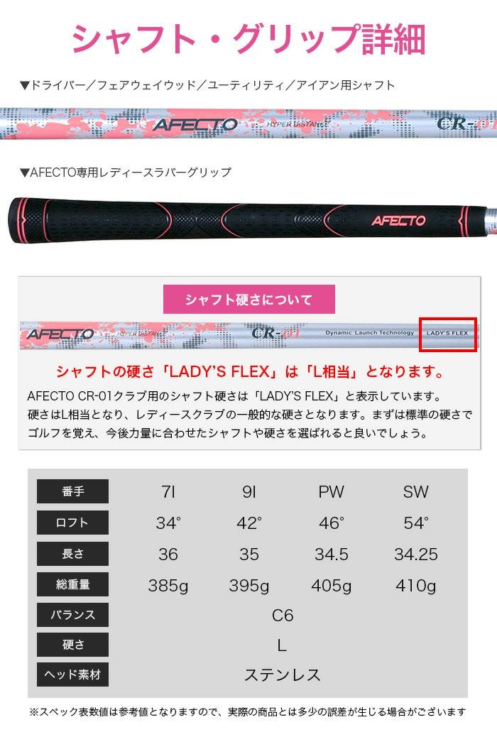 他の画像を見る 【右用】【左用】【レディース】AFECTO CR-01 レディース アイアンセット 4本組(7/9/PW/SW):【製造直販ゴルフ屋】※ 製造直販価格 ¥ 17,380 税込 詳細を見る お気に入りに登録する